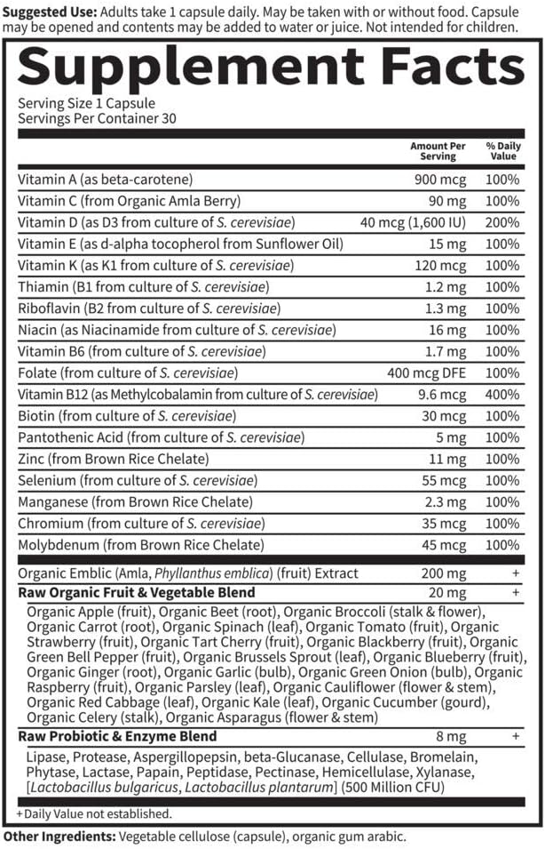 • MULTIVITAMIN WITH PROBIOTICS & WHOLE FOODS: One a day men's vitamins support prostate & heart health, energy and healthy stress response; 24 powdered organically grown raw fruits and vegetables add supporting antioxidants, vitamins & nutrient cofactors