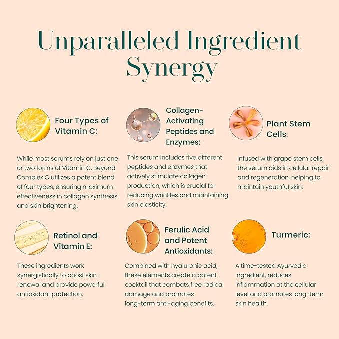 • 🍊 Why Choose Beyond Complex C?: Hylunia's serum goes beyond the ordinary by incorporating four types of Vitamin C, collagen-activating peptides, and plant stem cells for a holistic skincare experience. In contrast, most serums use only one or two types of Vitamin C, limiting their effectiveness. Beyond Complex C's high-potency antioxidants and retinol deliver comprehensive benefits, ensuring your skin receives the ultimate care and rejuvenation it deserves.