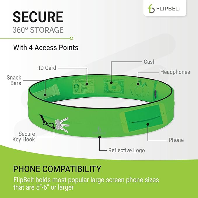 • MONEY & PHONE POUCH: The FlipBelt features 4 pocket openings to slip in all your must-have items, like cards, cash, and earphones, and it even has an internal key hook for added security. It’s bounce-free storage for your phone during your workout and is compatible with screens 5"–6" and larger.