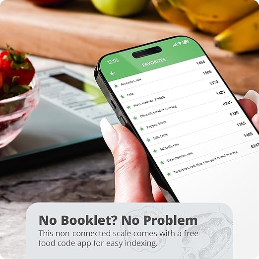 • Preloaded with nutrition data for 2,000 foods, plus space for 99 custom entries. Note: This is a standalone scale and does not sync with any devices. A free companion app is available for food code lookup only (not for logging or tracking).