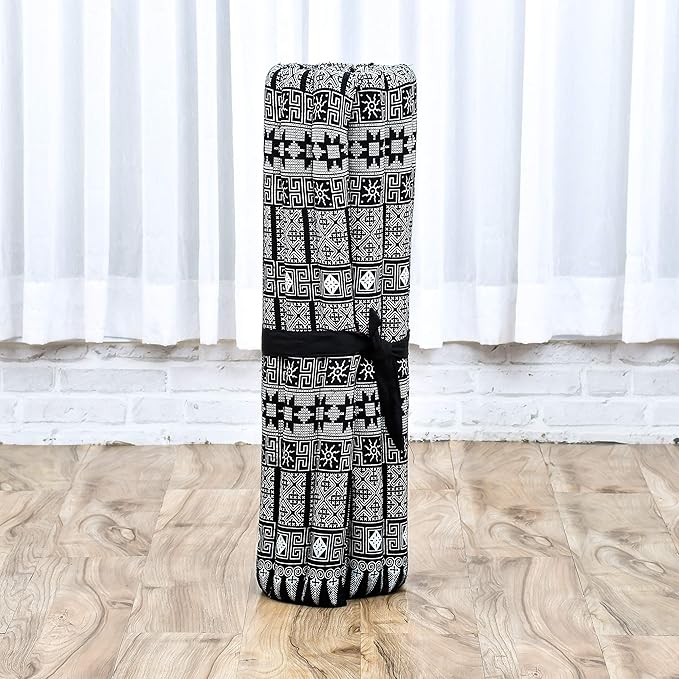 • Contents: The yoga meditation mat measures 28 x 28 x 2 inches (WxDxH) when spread out. After use, it can be rolled-up for storage and transport. The rolled-up mattress measures 28 x 8 x 8 inches (WxDxH)