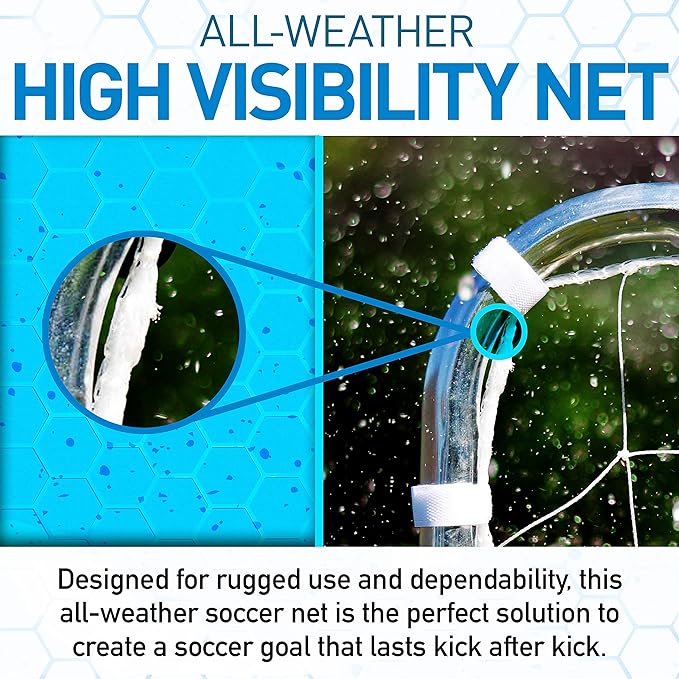 • ALL-WEATHER NET: Designed for rugged use and dependability; this all-weather soccer net is the perfect solution tso your goal or rebounder lasts kick after kick, score after score.