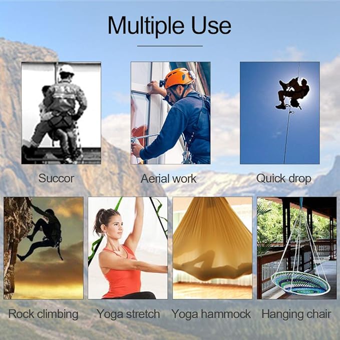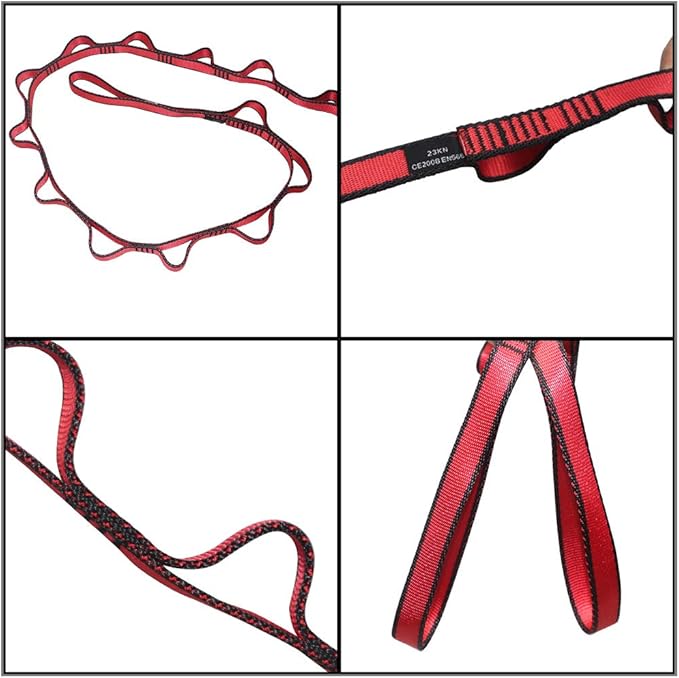 • The daisy chain is not only for climbing, but also for camping(you can attach carabiners to the loops and then hang your outdoor tools with the loops. When on camping trips, you can hang hammocks and or swings with it)