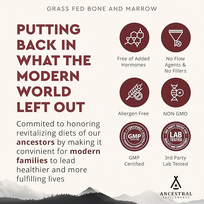 • NEW ZEALAND AND AUSTRALIAN GRASS FED BEEF: Made in small batches in the USA without GMOs, fillers, or flow agents and third party verified for purity, Ancestral Supplements' bone marrow capsules are sourced from 100% grass-fed cows, pasture raised without hormones in green fields.