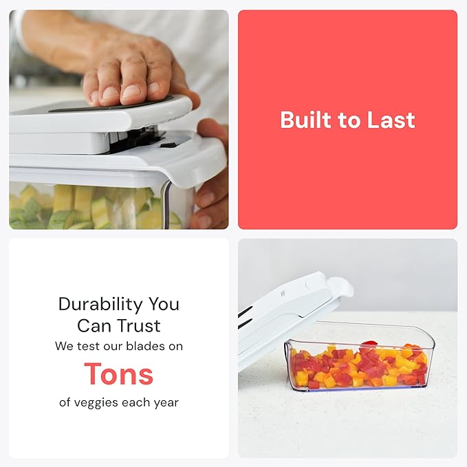 • Easy Meal Prep with Rust-Resistant Blades - Our vegetable chopper is perfect for anyone who wants to eat healthier but doesn't have a lot of time to spare. Dice potatoes, tomatoes, cucumbers, carrots, and more with the heavy-duty, rust-resistant blades. The 420 stainless steel blades retain razor sharpness for crisp, smooth dicing.