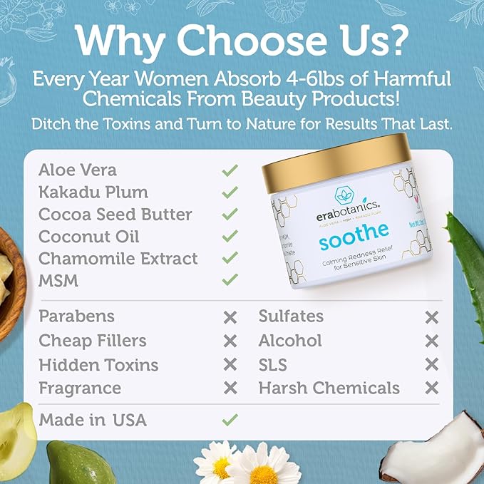 • Instant Relief & Long Term Skin Health: Don’t just mask symptoms of redness and irritation- Era Organics Soothe Rosacea cream treats your skin to nature’s best soothing ingredients to support a lifetime of stronger, healthier, happier looking skin