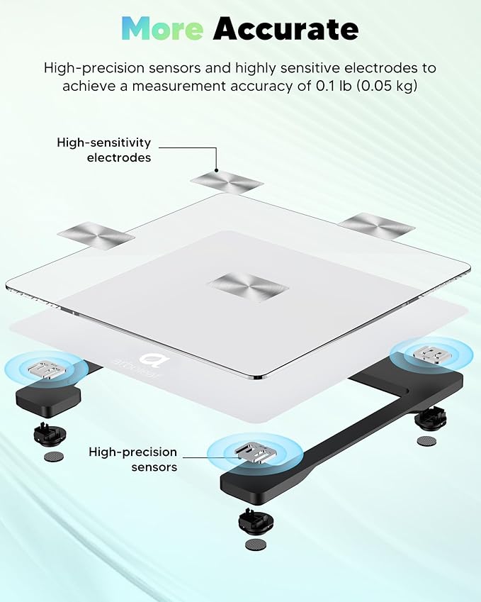 • Advanced BIA Technology for Deeper Insights: Equipped with BIA technology, 4 high-sensitivity electrodes, and 4 high-precision sensors, the Arboleaf smart scale delivers accurate, consistent readings of weight, body fat, muscle mass, and more—down to 0.1 lb / 0.05 kg