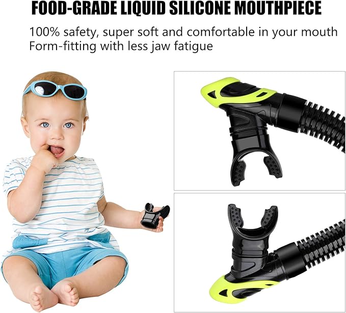 • Effortless Breathing with a Longer, Curved Tube: Our snorkel's larger-diameter oval upper tube delivers unrestricted airflow, letting you breathe naturally and comfortably. The curved design fits closely to your head, reducing drag and improving ease of movement—perfect for snorkeling, skin diving, scuba diving, and swimming.