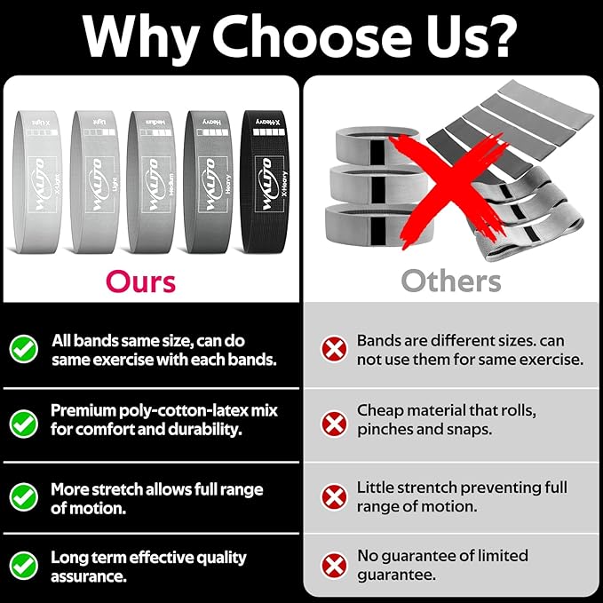 • [Set of 5 Resistance Levels] - workout bands resistance offer five different resistance levels ranging from light to x-heavy, suitable for all fitness levels. So, Never worry about the squat bands being too elastic or too small, your can easily switch between 5 levels according to your preferences at any time.