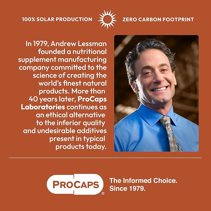 • Ethical & eco-friendly. zero carbon footprint - Uniquely committed to your health and the health of the planet, ProCaps’ facilities are 100% Solar Powered with a Zero Carbon Footprint and an LEED Gold green building status. All ProCaps bottles are made from 100% recyclable post-consumer resin. Plus, Andrew Lessman and ProCaps are the largest donor of prenatal vitamins in the world (over 2 billion capsules donated to date). ProCaps, the Informed Choice for Nutritional Supplements.