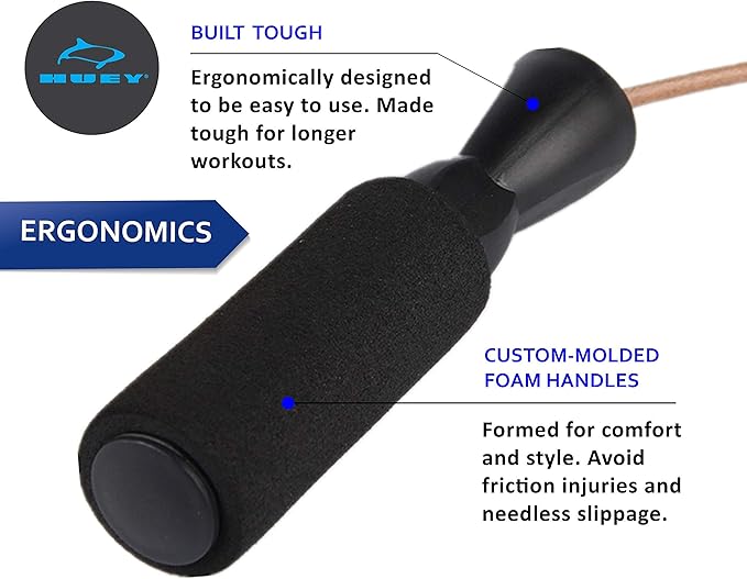 • ✅ BUILD TO LAST - Made from 100% GENUINE LEATHER, the HUEY Sport skipping rope is built to withstand HEAVY-DUTY use. Custom molded foam grips come with super-speed ball bearings that ensures smooth, effortless and even rotation.