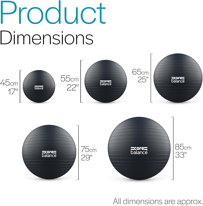 • RANGE OF SIZES FOR A PERFECT WORKOUT: Core Balance Gym Balls come in a choice of sizes to suit your height and workout in comfort. Check out our size guide (image 5) to determine whether you need a 55cm, 65cm, 75cm, or 85cm ball. As an added bonus, each gym ball includes a pump and tape measure to easily inflate to the correct capacity.