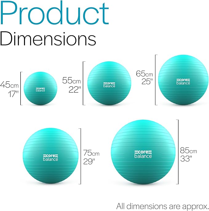 • RANGE OF SIZES FOR A PERFECT WORKOUT: Core Balance Gym Balls come in a choice of sizes to suit your height and workout in comfort. Check out our size guide (image 5) to determine whether you need a 55cm, 65cm, 75cm, or 85cm ball. As an added bonus, each gym ball includes a pump and tape measure to easily inflate to the correct capacity.