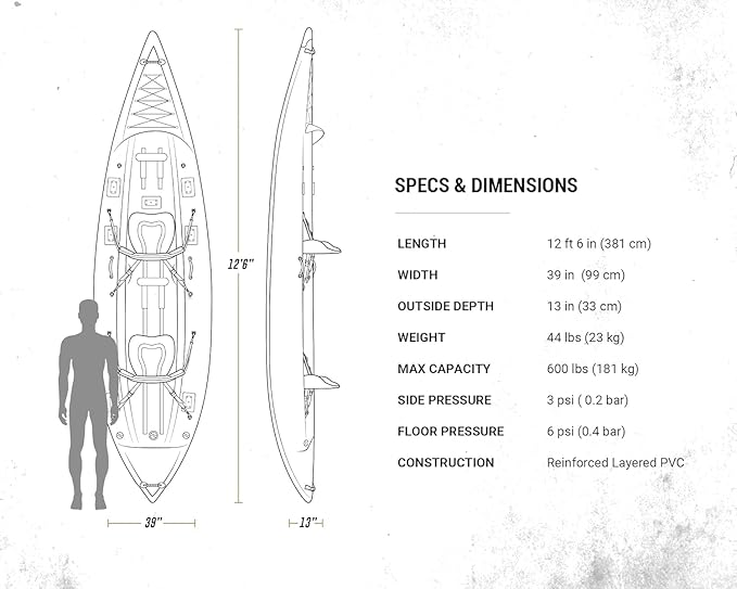• DIMENSIONS & SPECS - Hull Dimensions: 12' 6" x 3' 3", Hull Weight: 44lbs, Load Capacity: 600lbs, Rigid Dropstitch Floor, Front Bow Spray Shield, 7 x Hard Mounting Points, Halkey Roberts Locking Valves, Ample Bow/Stern Storage and Side Carry Handles