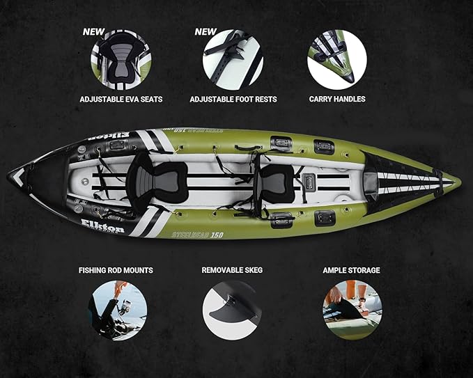 • INCLUDED - PVC inflatable fishing boat Kayak Fishing Boat, 2 x Lightweight Breakdown Kayak Paddles, Removable Skeg, Travel Bag with Backpack Straps, 2 x Padded High Back Support Adjustable EVA Seats, 2 x Drop-In Adjustable Foot Rest and a Dual Action High Volume / High Pressure Hand Air Pump.
