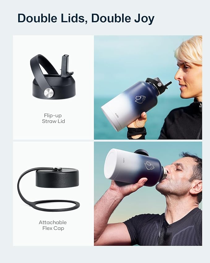• 2 Caps Pack: This 64 oz stainless steel water bottle comes with straw lid and flex cap, the flex cap is perfect for the beach, camping and hiking, while the straw lid is suitable for cycling and road trip