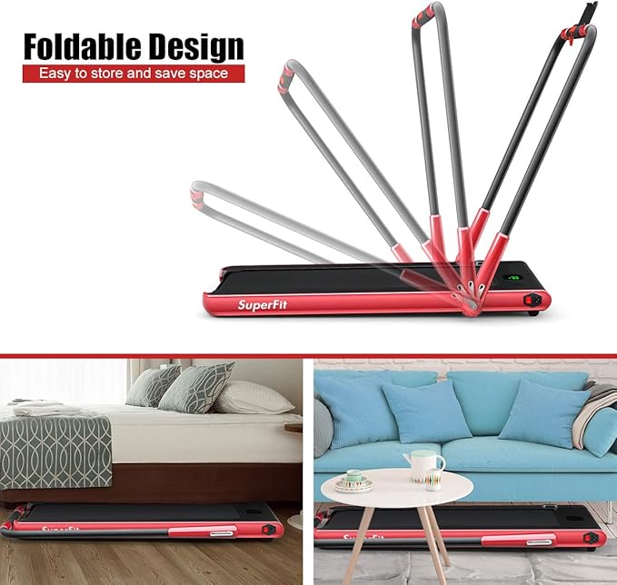 • Multiple Intensity: The multifunctional treadmill offers you multiple choices of workout intensity, you could do fast running with frame up and walk slowly under desk. Please do not use the treadmill on carpet to avoid overheating