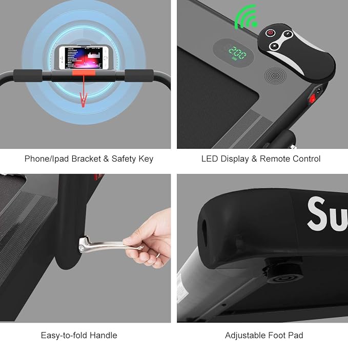 • Spacious Running Belt & LED Display & Phone Bracket: Excellent load-bearing capacity together with the wide and non-slip running area will improve safety during your workout. The LED display helps you clearly see your movement time, speed, distance and calories. Besides, the phone holder allows you to exercise while entertaining.