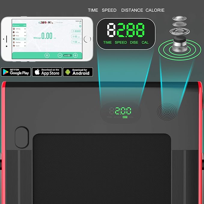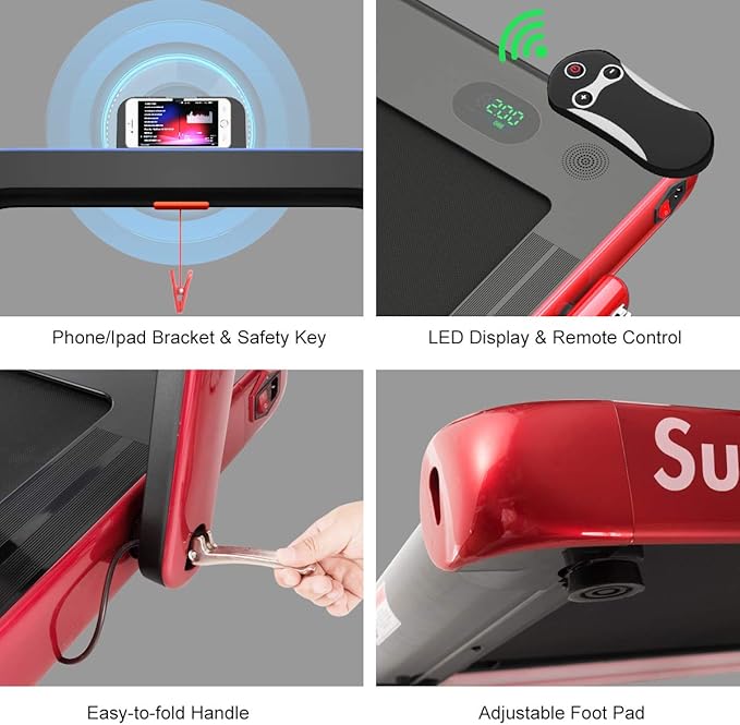 • 【Spacious Running Belt & LED Display & Phone Bracket】 Excellent load-bearing capacity together with the wide and non-slip running area will improve safety during your workout. The LED display helps you clearly see your movement time, speed, distance and calories. Besides, the phone holder allows you to exercise while entertaining.