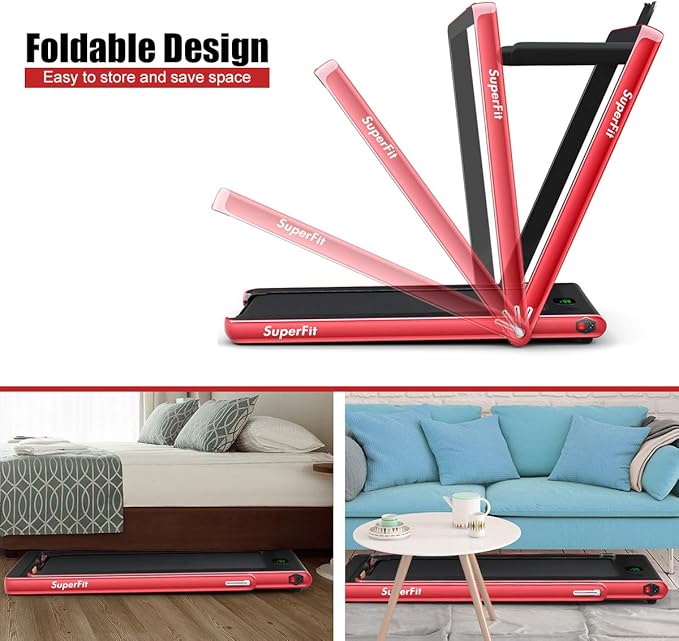 • 【2 in 1 Running & Walking Treadmill】 GYMAX 2-in-1 treadmill offers you two modes of exercise. When you raise the riser up and install the armrests, you can shape your body with the maximum speed of 7.5MPH. When the riser is folded, you can put it under your table to enjoy walking at a speed of 0.6MPH-25MPH while working. Meanwhile, speed unit could be switched between mile and km in APP