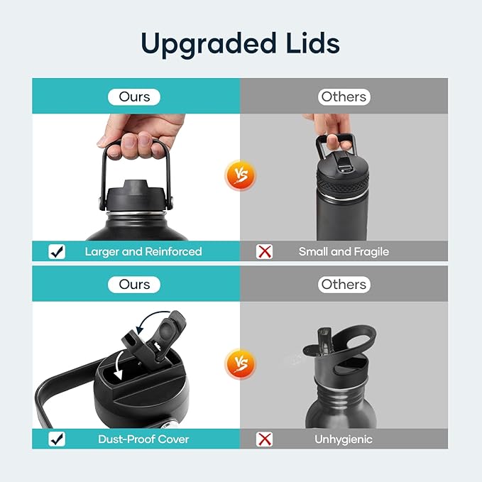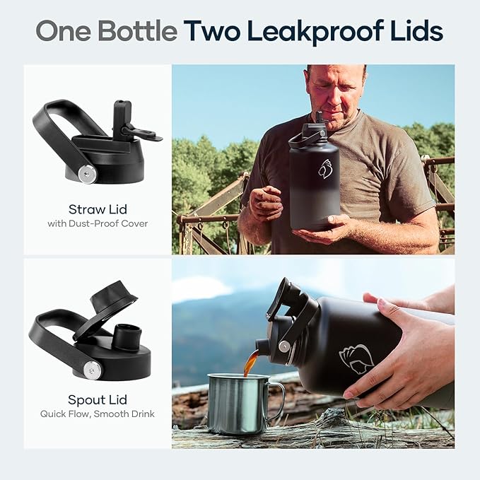 • 2 Lids to Max Its Usability: This half gallon stainless steel bottle comes with a straw lid and a flex cap to gear up your games and explorations. Both caps can seal airtight with 100% leak-proof, so you can drink without a spill on the road. *NOTE: ONLY the 22oz and 32oz T-shape bottles fit in any cup-holders*