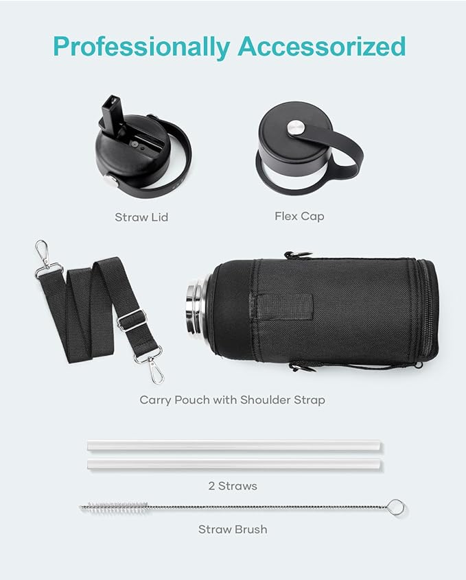 • What You Get: Included with a BUZIO insulated water bottle, a straw lid (2 straws), a flex cap, and a cleaning brush.