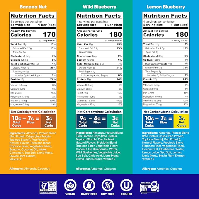 • KETO FRIENDLY SNACKS w/ Only 2-3g Net Carbs in Every Serving - Net carbs are carbs that are absorbed by the body, and our keto treats come with only 2-3g of net carbs in every serving. Each keto plant based protein bar is packed with 9-12g of total carbs, 6-9g of fiber, 10-13g of fats & 160-180 calories. Enjoy our 6 flavors Chocolate Sea Salt, Peanut Butter Chip, Almond Butter Chip, Lemon Blueberry, Banana Nut, Wild Blueberry