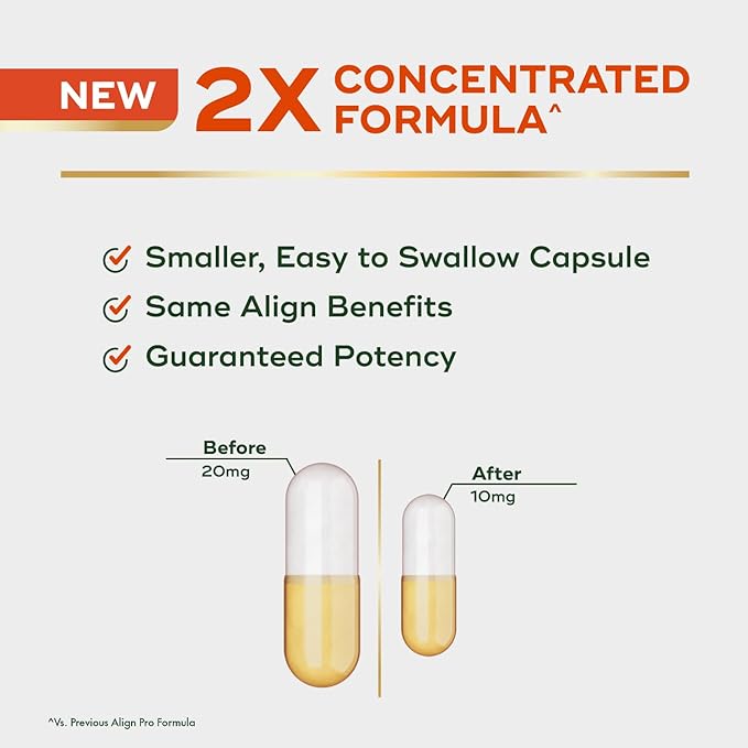 • NEW 2X CONCENTRATED FORMULA: Our new formula uses 2x concentrated probiotic material. This allows for the same CFU count and the same benefits you love from Align in a smaller, easy to swallow capsule. (Vs Previous Align Pro Formula)