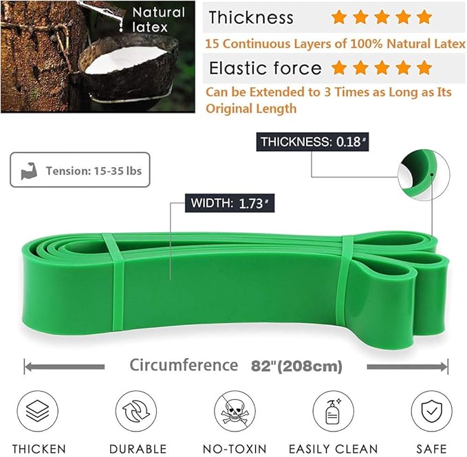 • ✅ PERFECT FOR ANY KIND OF EXERCISE These green workout bands provide resistance of 50-120lb. Our heavy-duty rubber bands have medium to heavy resistance for leg/back exercises and dynamic resistance for powerlifting. The flat pull-up resistance bands are perfect for assisting your pull-ups.