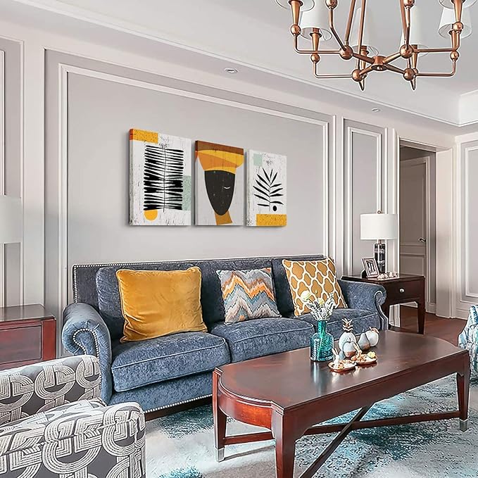 Framed Canvas Wall Art African Ethno Motive Wall Art Set, Abstract Ethno Art, African American Woman Portrait, Black Orange Print, Contemporary Collage, Minimalist (A-3pcs,12x16inchx3pcs)