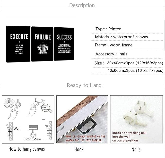 • 【Motivational Wall Art For Office】 The Size of the office canvas wall art set is: 12x16inchx3pcs (30x40cmx3pcs). The modern wall art prints perfectly combine quotes such as Execute, Failure, Success, making the artworks more inpirational and motivational. The inpirational wall art set is the best choice for home office gifts or boss office decoration.