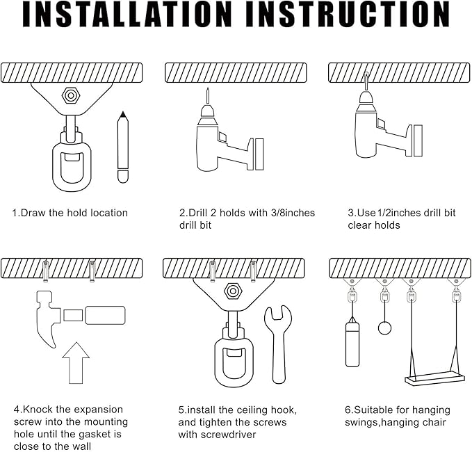 • Widely used in WOOD and CONCRETE : Our swing hardware provides 2 SCREWS for WOOD and 2 EXPANSION BOLT for CONCRETE, Perfect for Ceiling, Punching Bag, Porch Swing, Hammock, Swing Chair, Ring, Yoga Swing, Boxing Equipment, etc.
