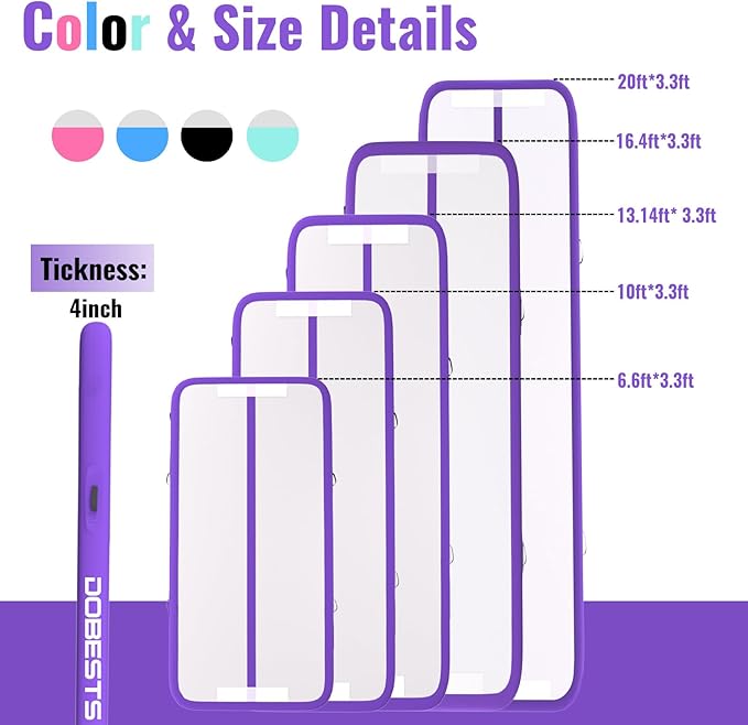 DOBESTS Inflatable Air Gymnastics Mat Tumbling Mat Tumble Track Gymnastics Training for Kids Home 6.6 feet 10 feet 13feet 16feet 20feet 4/8inch Thick for Cheerleading Dance Yoga Cheer Water With Pump
