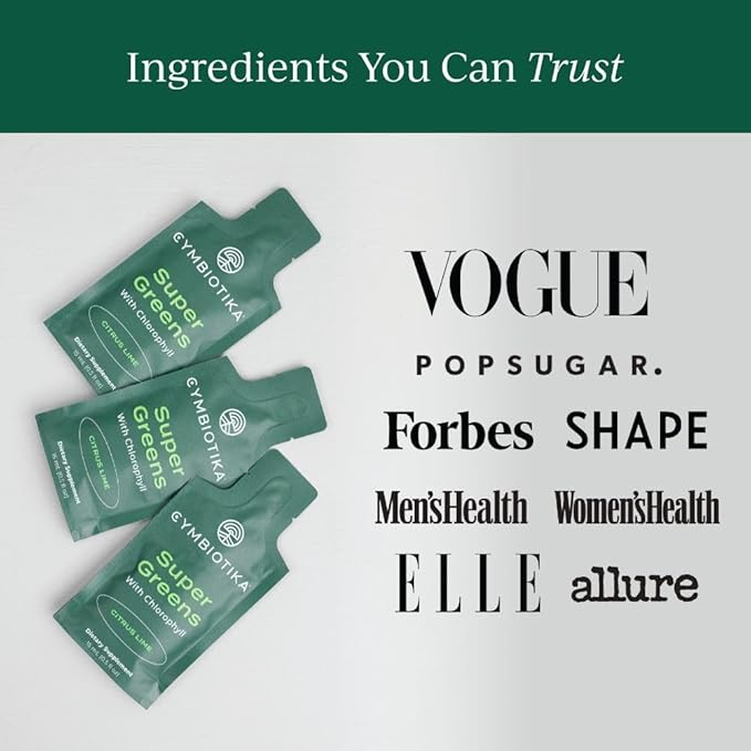CYMBIOTIKA Super Greens Supplement with Chlorophyll, Spirulina, Daily Vegan Superfood Packets for Digestive Gut Health, Detox, Energy and Immune Support, Citrus Lime Flavor, 15 mL Pouches, 30 Pack