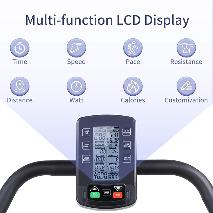 • LCD MONITOR-Curved treadmills for running equipped with a 5” mini LCD screen, which tracks your time, distance, calories, watt(energy consumption), speed, pace, load(resistance: L1-L4), help you record important data during exercise. There are also custom functions to help you achieve your sports goals.