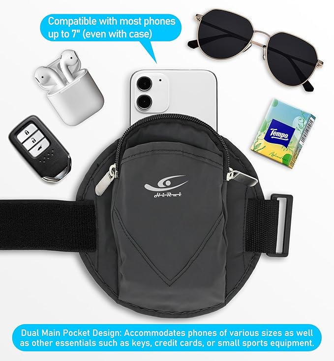 • All-in-One Storage Solution: Stay organized and hands-free with our upgraded sports armband! Featuring a dual-pocket design, it accommodates phones up to 7 inches (even with a case) and provides ample space for keys, credit cards, earphones, or other small essentials. Perfect for keeping your belongings secure and accessible during any activity.