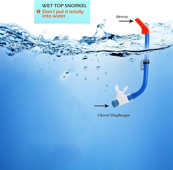 • SEMI-DRY kids snorkeling se: Our Kids Snorkel Set is with semi-dry top to remind the kids not diving too deep into water to insure safety. The purge valve allows for easy clearing and draining water out of the snorkel. NOTE: Please clean sands in the tube carefully before next time use