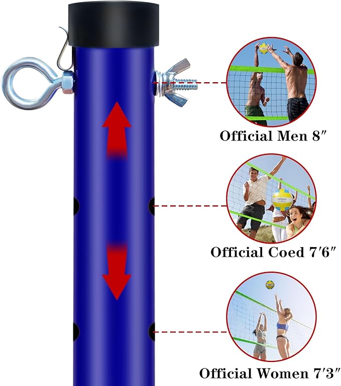• Official size volleyball net: 32ft x 3ft, 𝐇𝐞𝐢𝐠𝐡𝐭 𝐀𝐝𝐣𝐮𝐬𝐭𝐚𝐛𝐥𝐞 𝐏𝐨𝐥𝐞𝐬 for this volleyball net set, easy conversion for the height design. 8' for men, 7.6' for co-play, and 7.3' for women. And set up height of 5.1‘ for badminton game, professional level net; come with durabel guideline and 4 steel stakes to fully support its stability