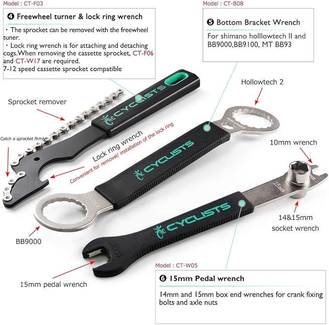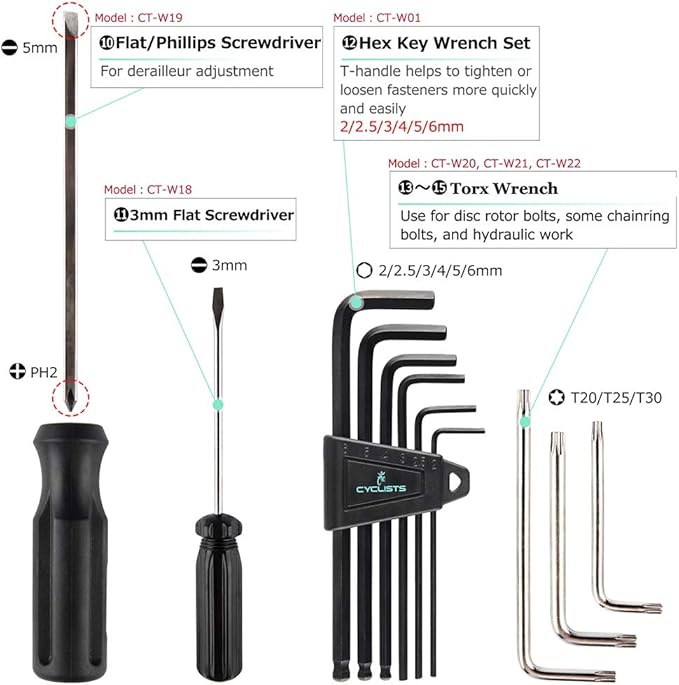 • 【Bicycle Repair Tool Kit Includes】: Chain rivet extractor, Chain ring nut wrench, Crank puller, Freewheel turner&lock ring wrench, Bottom brachet wrench, 15mm pedal wrench, Hex hey wrench(8mm), 2-in-1 master link chain pliers, Tire lever, Flat/phillip screwdriver, Flathead screwdriver, Hex key wrench set, Torx wrench, Hub spanner, Spoke wrench, Crank cap wrench, Lockring removal tool, Cartridge BB tool, Tire patch kit.