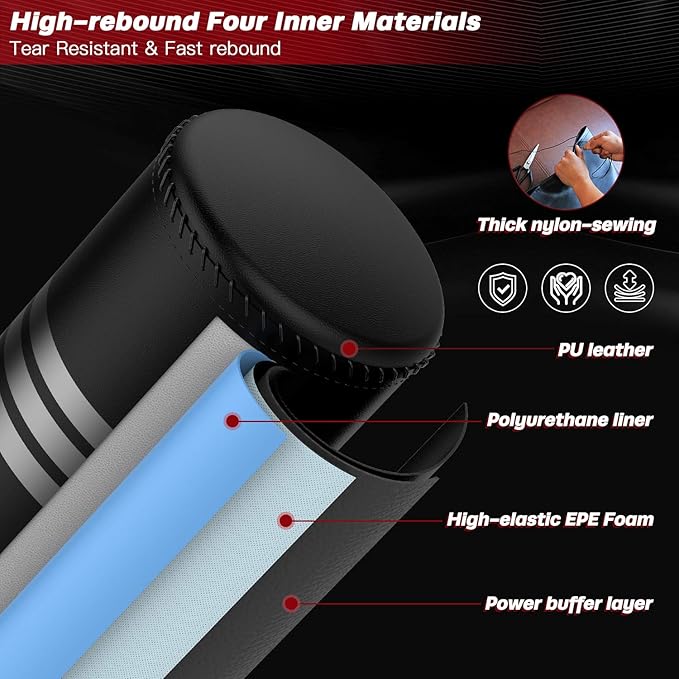• Quality Four Inner Materials and Stitching: Features with thick and high-density PU leather, power buffer layer, high elastic EPE Foam and polyurethane liner. Top-filled terylene cotton enhances plumpness, thick nylon-sewing makes every boxing more pleasant. Together with boxing gloves, not to hurt fingers and elbow joints