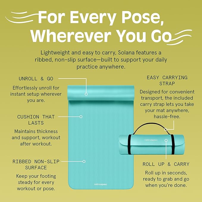 • EXTRA THICK FOR COMFORT & BALANCE: Solana firm 1-inch extra thick fitness mat w/ mat strap alleviates stress on pressure points such as joints, hips, hands, and knees. Solana measures 72" X 24" X 1".