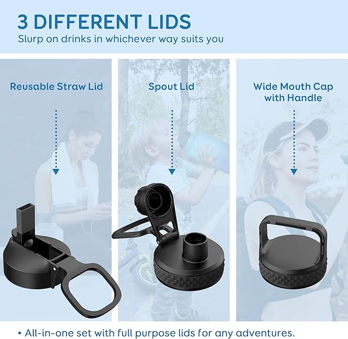 • Flexible Drinking On-the-Go: This water jug comes with 3 different lids. The screw-on lid with flip-up handle is for easy ice refilling with superior portability; spout lid makes it convenient to drink hot liquid and straw lid for sipping cold.