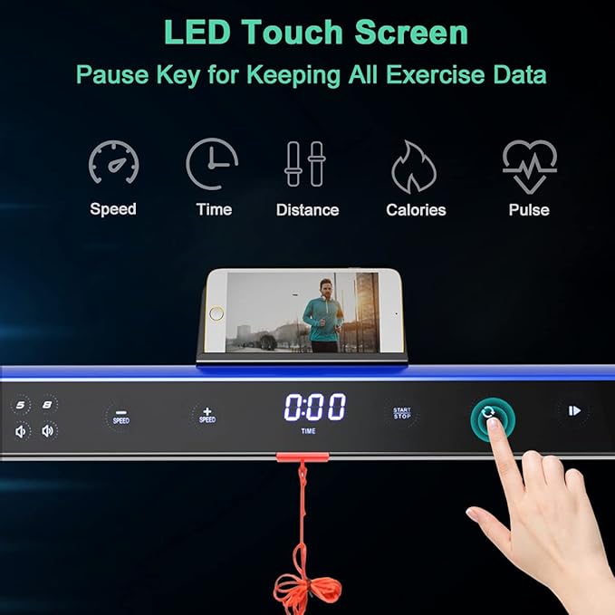 • 𝗦𝗶𝗺𝗽𝗹𝗲 𝗢𝗽𝗲𝗿𝗮𝘁𝗶𝗼𝗻: This under desk treadmill features LED touch screen, offering real-time feedback of calories, pulse, time, distance and speed. The treadmill could also be control and adjust via App and remote. Furthermore, all sports data will be kept when you press the pause key for water break and you can switch speed unit between mile and km in APP.