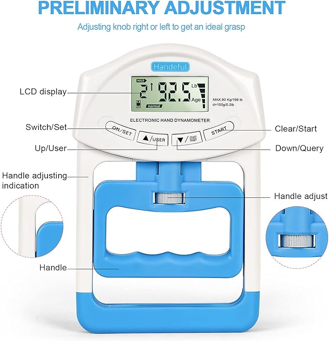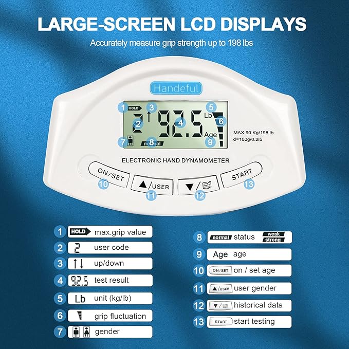 • [LCD Display] - Large LCD screen shows all measurements clearly on the same screen. Displayed measurements include user code, age, gender, grip value in pound or kg, and grip status. A maximum grip value display and weak, normal or strong power levels can be saved and easily recalled for comparison.