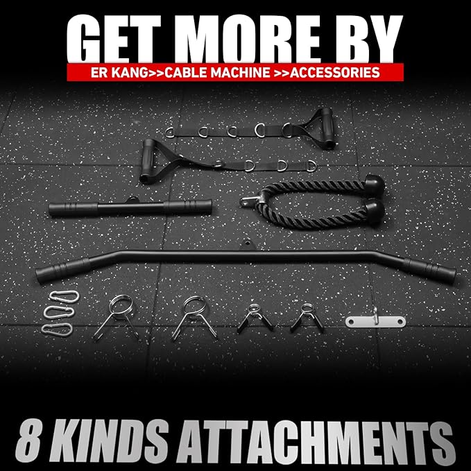 • 【DESIGNED FOR HOME GYM】Big footboard on the Base-perfect attachment for the seated cable row. Upward 10° of Weight peg can prevent weight plates slip off. It also comes with detachable sleeves to fit 1''/2'' plates. Special four buckles strap handles can let you easily adjust the length you want. Also, this machine comes with 3 additional attachments: Lat bar, Cable bar, and Tricep rope.
