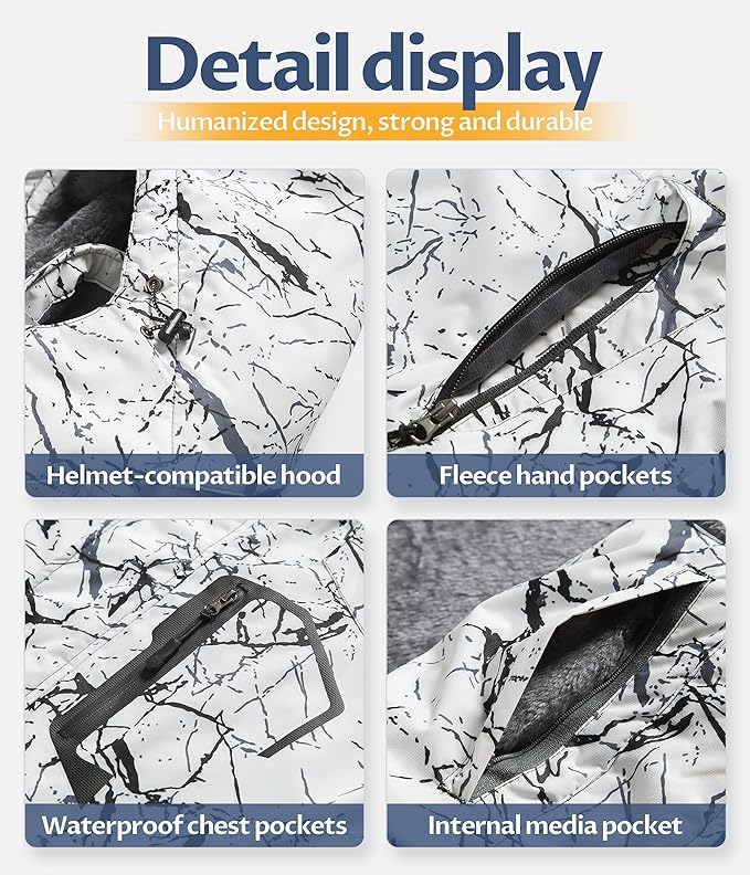 • ❄ Functional Pockets--Snowboarding jacket with waterproof chest zipper pocket(ski pass pocket), 2 zippered micro fleece handwarmer pockets. Internal media pocket with media port. Internal large pocket can put ski goggles, water glasses.