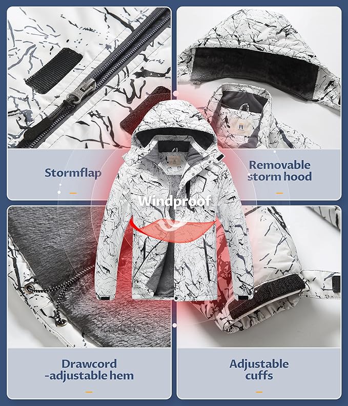 • ❄ Humanized Design--This windbreaker snowboard jacket with Adjustable helmet-compatible hood, smoothly taffeta liner arm design makes the movement more flexible. Durable tear resistance Armpit design.