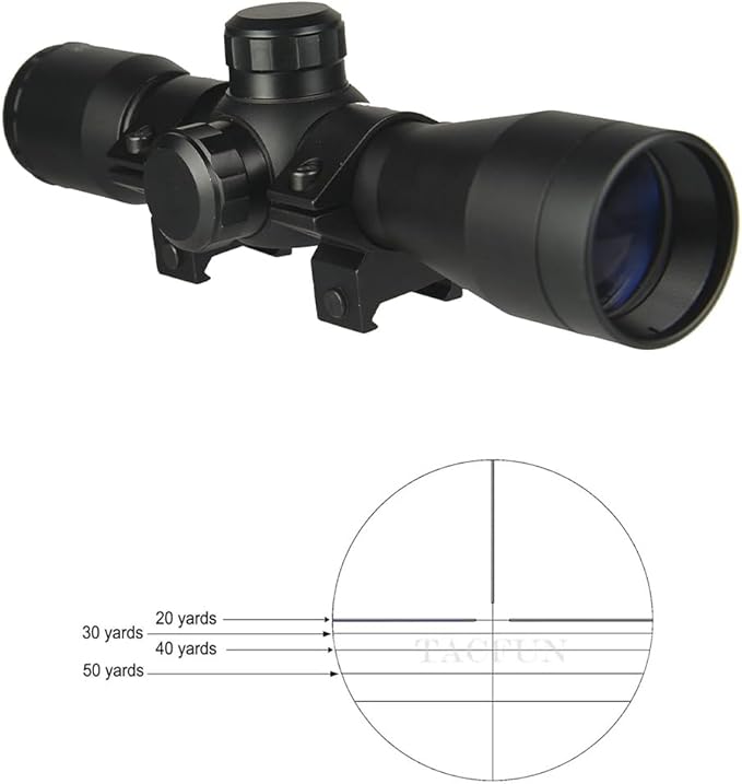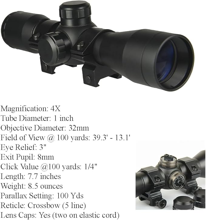 • The scope features 4x magnification with the multi-layer coated lenses, light-transmission up to 93%, that provides maximum brightness, clarity and contrast.