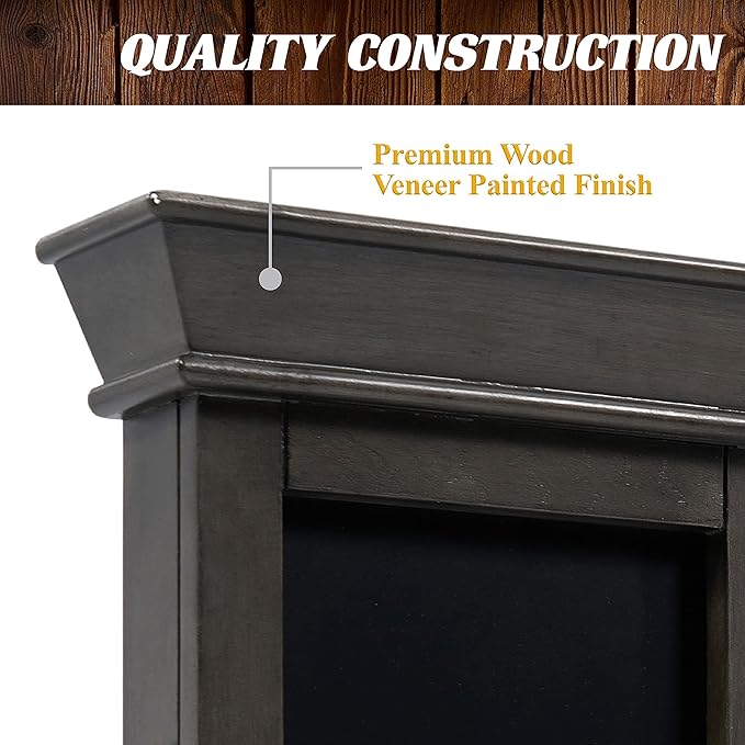 • CRAFTSMANSHIP: The cabinet display is black flannelette cloth lined and made of MDF with a painted wood veneer finish and provides 41.375” x 23.6” of wall protection, LED lights are powered by 4, AA batteries (not included).