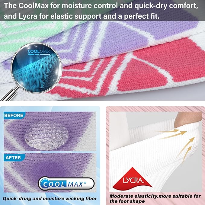 • [Durable and breathable] The athletic socks are made from Lycra spandex and moisture-wick Nylon. The Lycra fabric features good tear resistance, stronger and more compression than other sport socks. The moisture wicks through the Nylon to a wider surface area for a greater evaporation rate, keeping your feet dry, breathable and odor-free longer